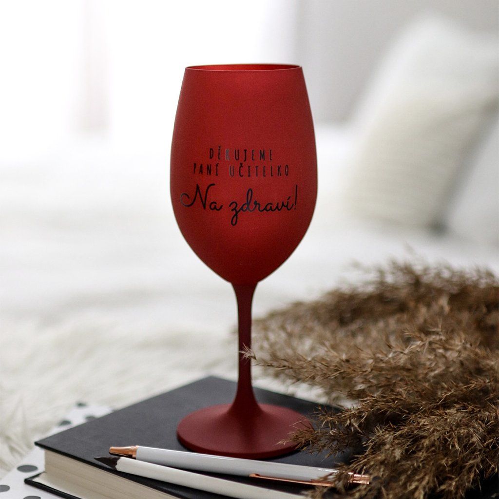 Bordová sklenice na víno 350 ml - DĚKUJEME PANÍ UČITELKO, NA ZDRAVÍ
