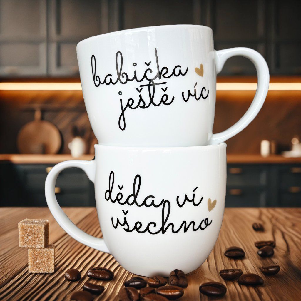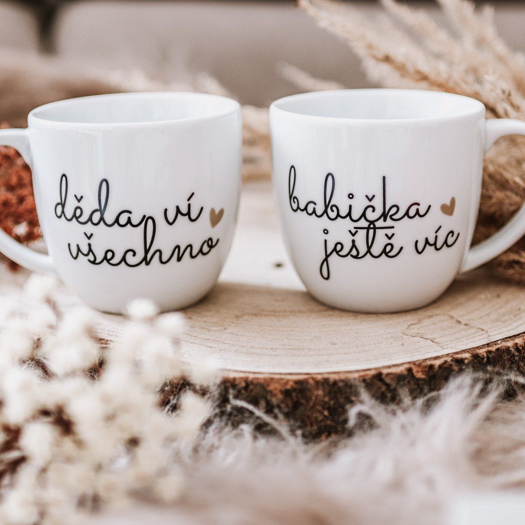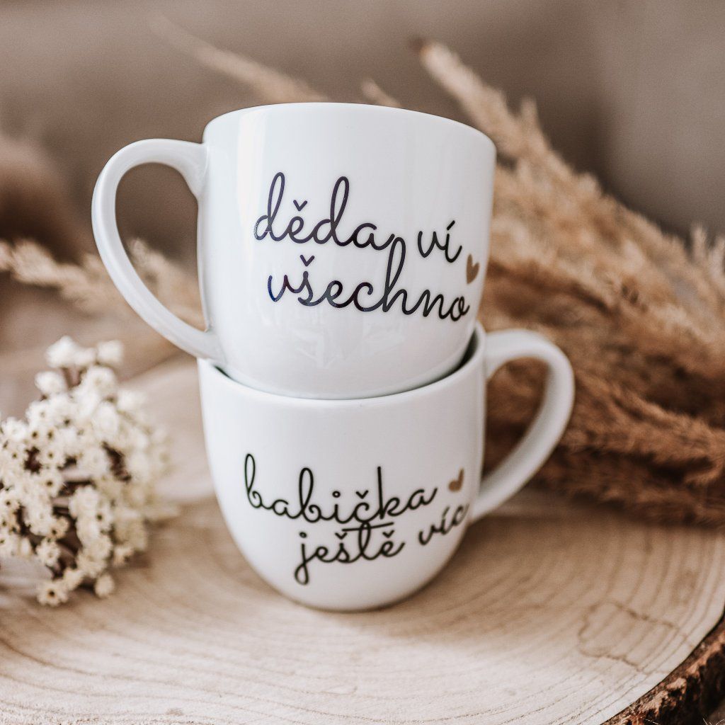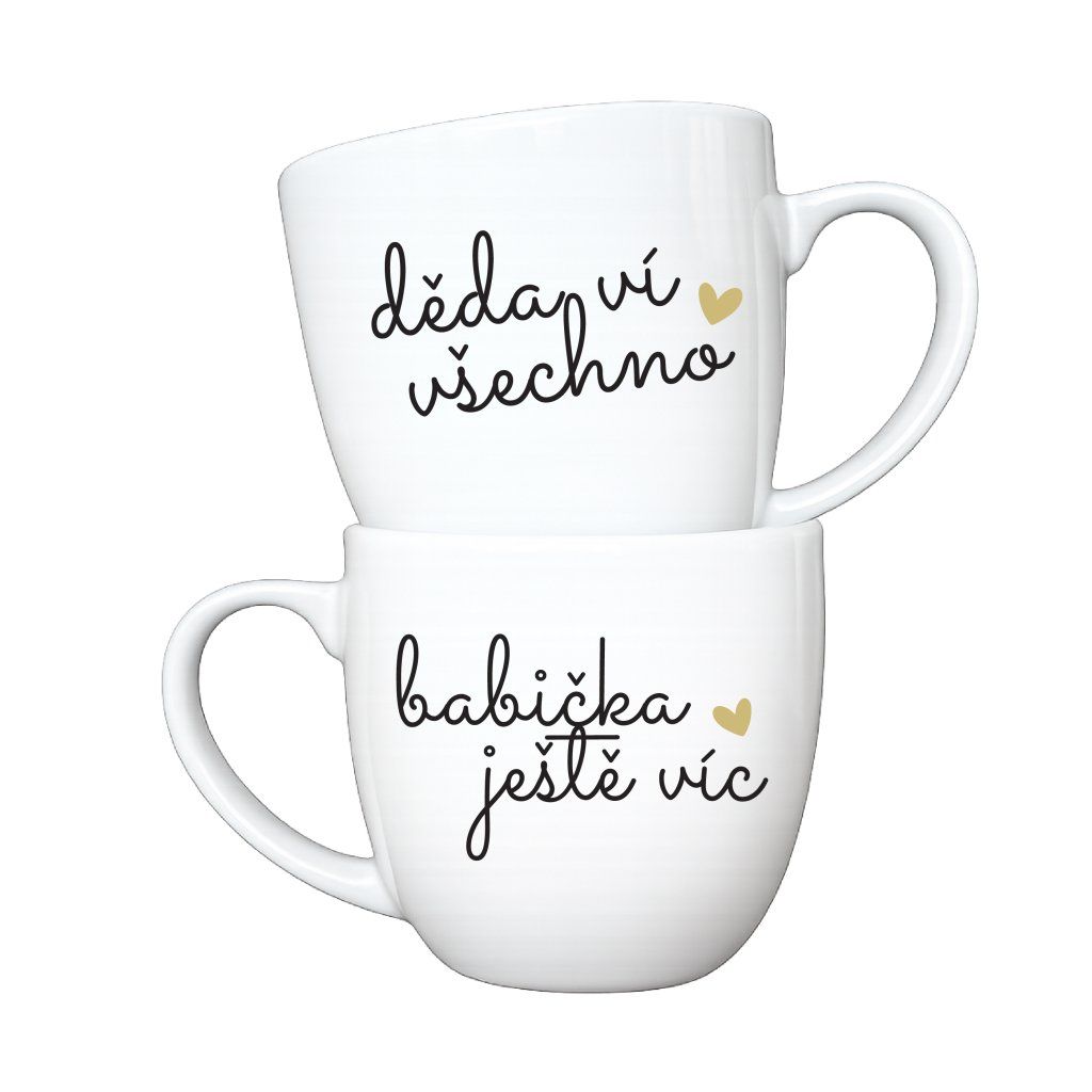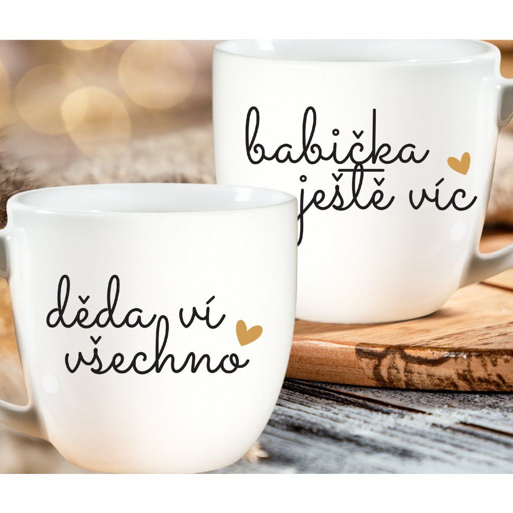 Párové porcelánové hrnky 2x330 ml - DĚDA VÍ VŠECHNO, BABIČKA JEŠTĚ VÍC