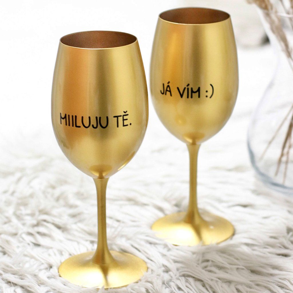 Párové zlaté sklenice na víno 2x350 ml - MILUJI TĚ, JÁ VÍM