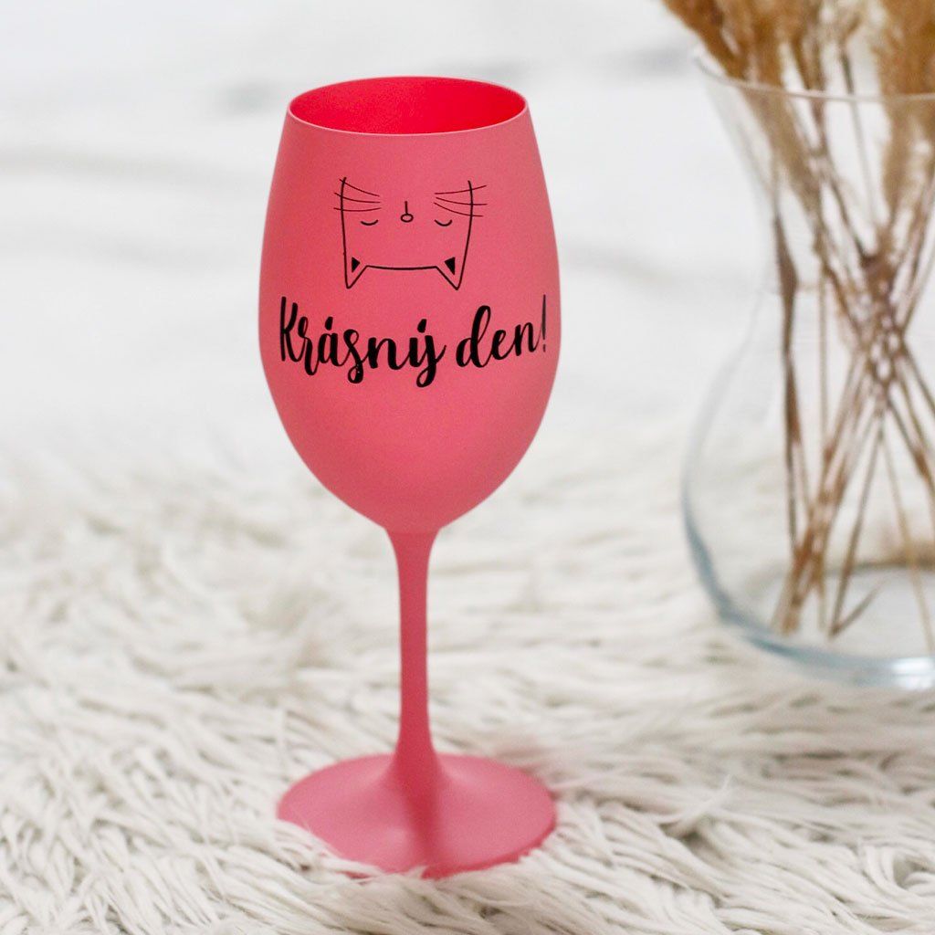 Růžová sklenice na víno 350 ml - KRÁSNÝ DEN, KOČIČKA