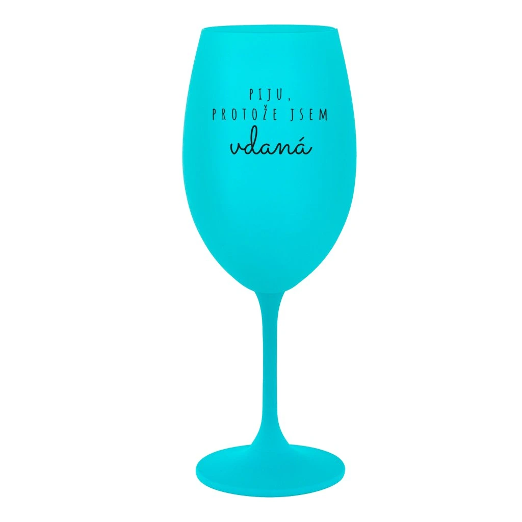 Tyrkysová sklenice na víno 350 ml - PIJU PROTOŽE JSEM VDANÁ